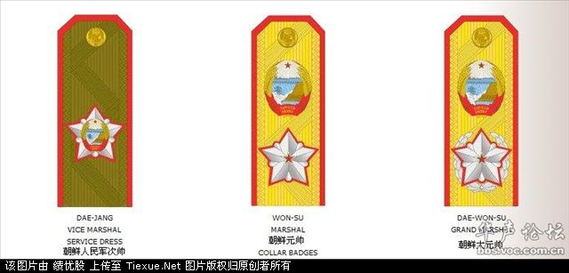 Riêng quân hàm Đại nguyên soái được nhà nước Triều Tiên phong cho cố Chủ tịch Kim Nhật Thành vào năm 1954 với vai trò thống soái các lực lượng vũ trang giống như Nguyên soái Stalin của Liên Xô trước đây.