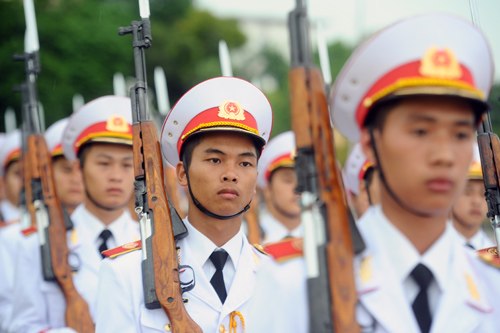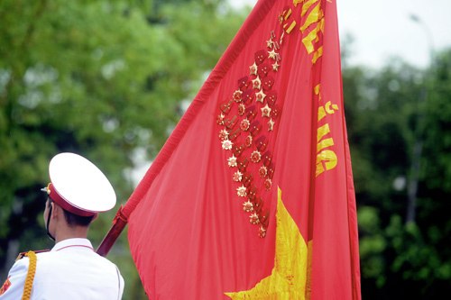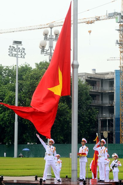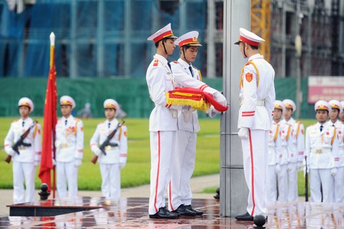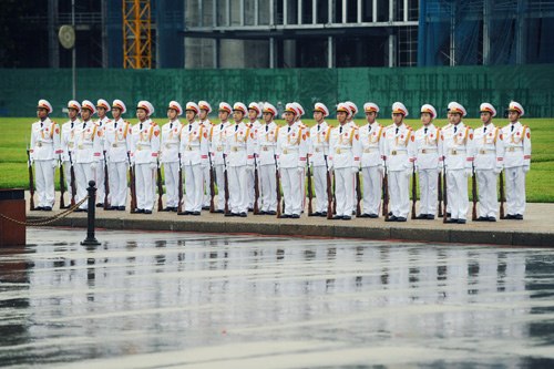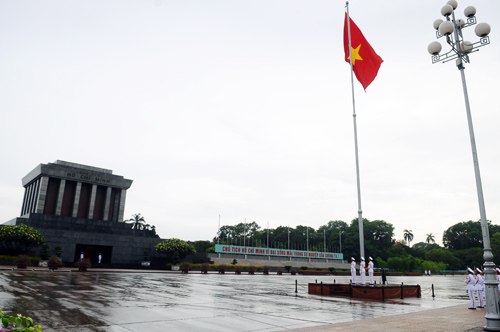 Dù thời tiết nắng hay mưa, cứ gần 6h sáng, các chiến sĩ thuộc đoàn 275 (Bộ Tư lệnh bảo vệ lăng Chủ tịch Hồ Chí Minh) lại thực hiện nghi lễ thượng cờ, chào cờ tại Quảng trường Ba Đình.