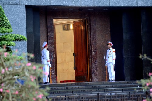 Sau lễ thượng cờ, đội tiêu binh đi một vòng trước cửa lăng và kết thúc nghi lễ. 21h hàng ngày, lễ hạ cờ với nghi thức tương tự lại được diễn ra.