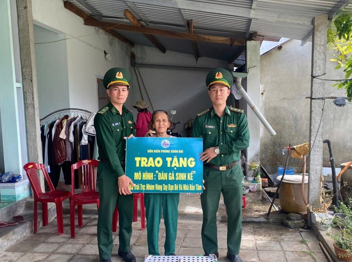 Cán bộ Đồn Biên phòng Xuân Đài, Bộ đội Biên phòng tỉnh Đắk Lắk trao tặng mô hình “Đàn gà sinh kế” cho các hộ dân có hoàn cảnh khó khăn trên địa bàn, góp phần mang đến niềm vui, động lực để bà con đón mùa xuân mới ấm áp, nghĩa tình. Ảnh: Đơn vị cung cấp
