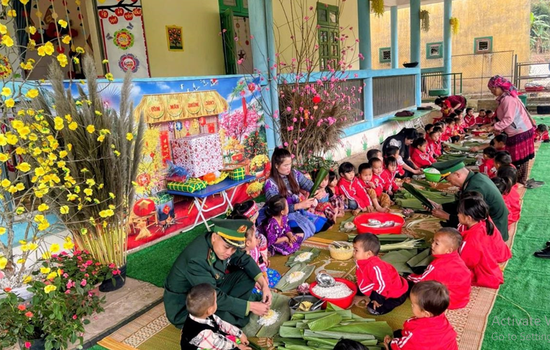 Chi đoàn Đồn Biên phòng Nậm Nhừ, Bộ đội Biên phòng tỉnh Điện Biên phối hợp với Trường Mầm non Nậm Nhừ, xã Nà Hỳ, tỉnh Điện Biên tổ chức hoạt động trải nghiệm với chủ đề “Ngày Tết quê em” cho các cháu học sinh tại điểm trường Mầm non Nậm Chua 1, xã Nà Hỳ, góp phần mang không khí Tết cổ truyền ấm áp đến với trẻ em vùng biên giới còn nhiều khó khăn. Ảnh: Xuân Điềm