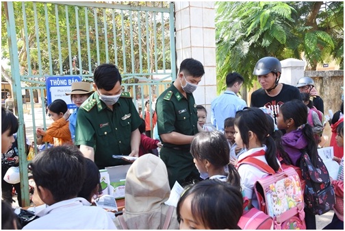 Đồn Biên phòng cửa khẩu Hoa Lư, BĐBP Bình Phước phát khẩu trang miễn phí cho học sinh Trường Tiểu học và Trung học cơ sở xã Lộc Hòa, huyện Lộc Ninh. Ảnh: Lâm Anh.