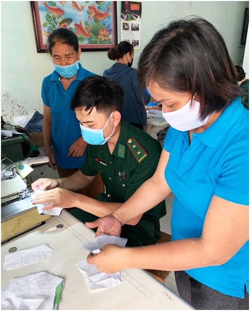 Đồn Biên phòng Phú Lộc, BĐBP Đà Nẵng phối hợp với Hội LHPN quận Thanh Khê may 13.000 khẩu trang phát miễn phí tặng người dân trên địa bàn. Ảnh: Thanh Trúc.