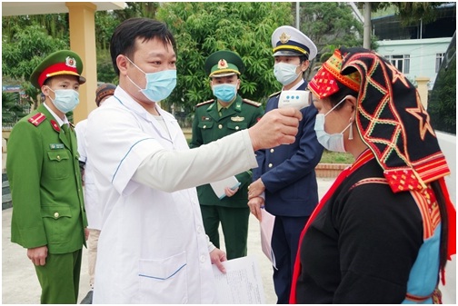Đồn BPCK Ma Lù Thàng, BĐBP Lai Châu phối hợp lực lượng chức năng kiểm tra thân nhiệt cho người dân. Ảnh: Đức Duẩn.