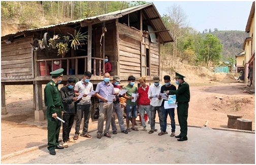 Đồn Biên phòng CKQT Lao Bảo, BĐBP Quảng Trị phát tờ rơi tuyên truyền phòng, chống dịch Covid-19 tại bản Ka Tăng, thị trấn Lao Bảo, huyện Hướng Hóa, Quảng Trị. Ảnh: Thừa Văn.
