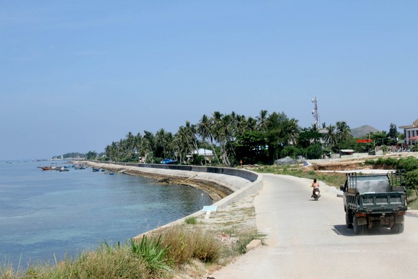 Con đường dẫn vào trung tâm huyện đảo được trải bê tông với một bên là biển và một bên là những hàng dừa xanh