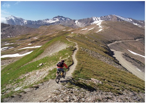 Một vận động viên lái xe đi giữa hai quốc gia. Bên trái là Thụy Sỹ và bên phải là Áo. Đường biên giới thân thiện đơn giản chỉ là lối mòn nhỏ.
