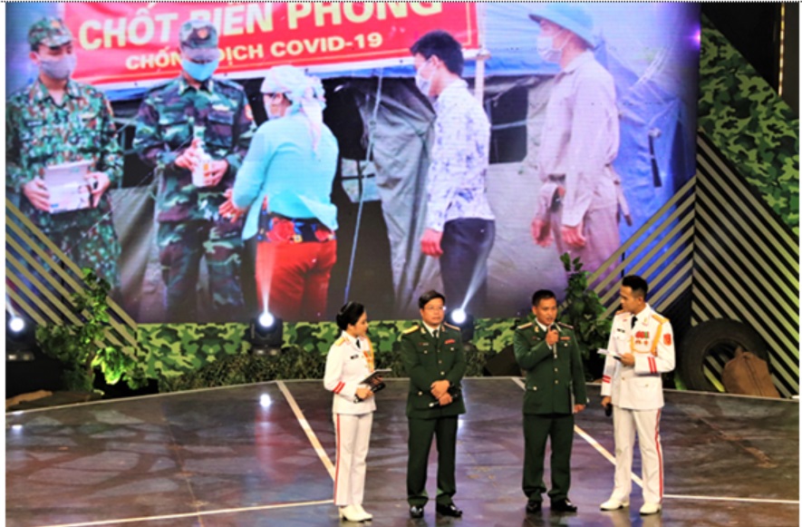 Thượng úy Lê Huy Đức (thứ 3 từ trái qua) trở thành nhân vật điển hình giao lưu về công tác chống dịch tại Ga-la “Chiến sĩ” năm 2020 do Tổng Cục Chính trị phối hợp với Đài Truyền hình Việt Nam tổ chức. Ảnh: Thanh Thuận