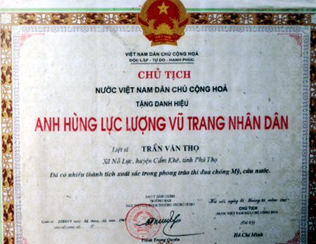 Bản sao danh hiệu Anh hùng LLVT của liệt sỹ Trần Văn Thọ do Chủ tịch Hồ Chí Minh ký ngày 1/7/1967.