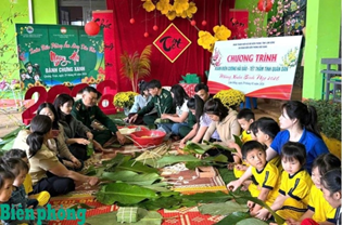 Cán bộ, chiến sĩ Đồn Biên phòng Đắk Dang và người dân tham gia hoạt động gói bánh chưng trong Chương trình “Xuân Biên phòng ấm lòng dân bản”. Ảnh: CTV